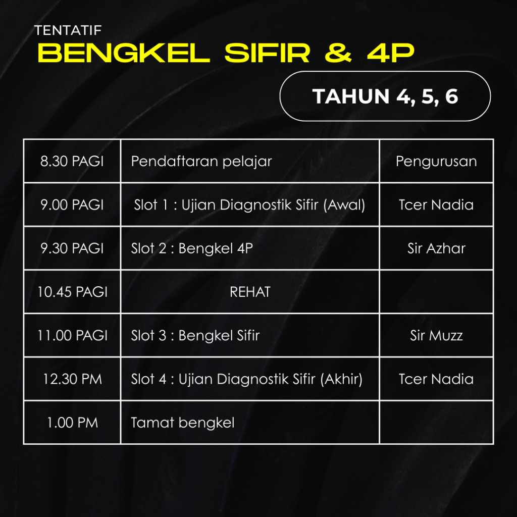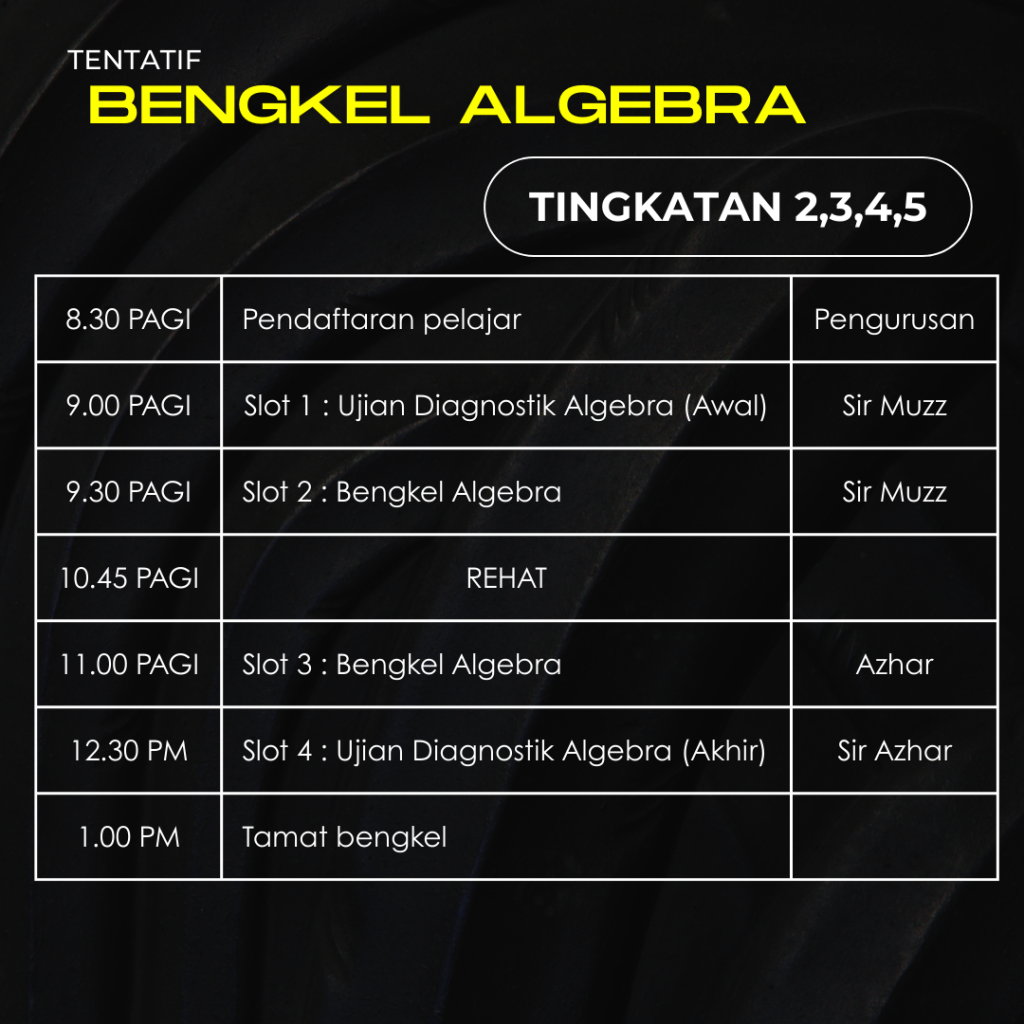 Dalam bengkel ni, guru ajar pelajar mahirkan teknik sifir, runtuhkan mental block “Matematik Susah’ dan guru akan ajar teknik mudah step-by-step pengukuhan algebra.